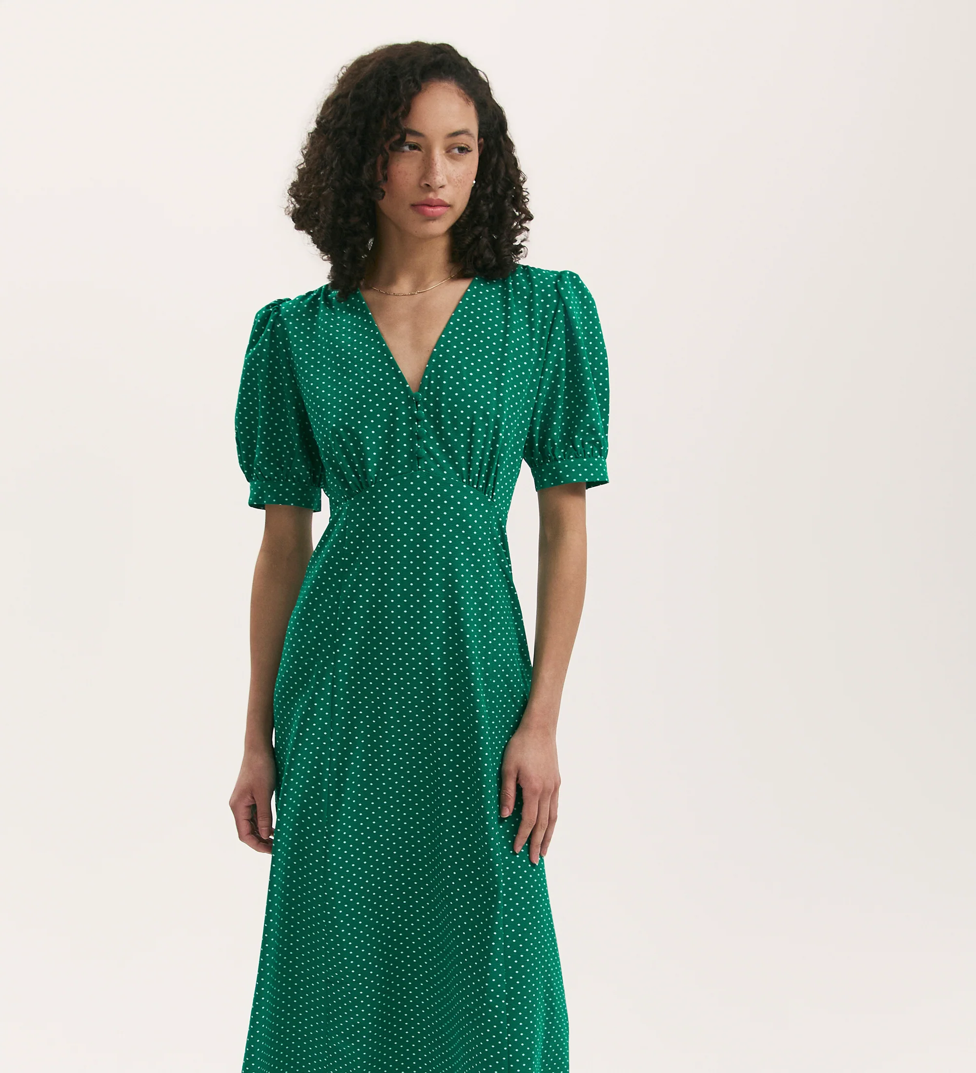 A wardrobe go-to, Colette is a green polka dot midi tea dress crafted from our crease-free crepe fabric and has short puff sleeves. She also features an empire waist, a feminine v-neck with button detail at the bust.