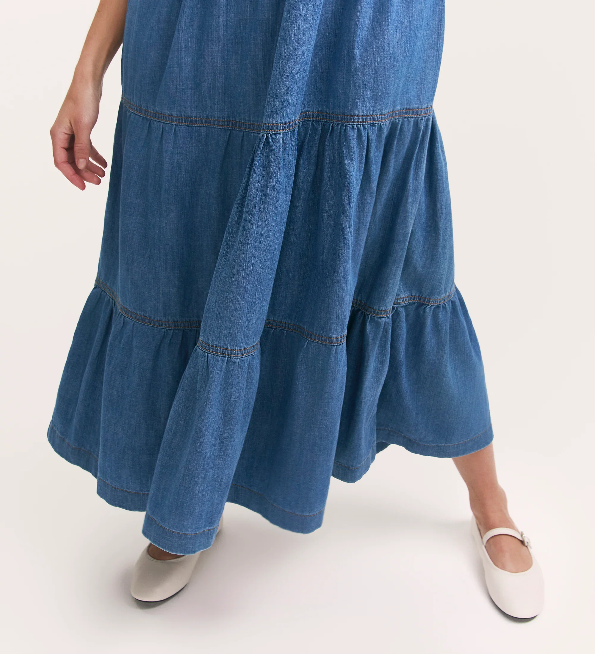 A throw-on-and-go style you can reach for every day, Essie is a relaxed fit, mid blue denim sleeveless midi dress crafted from our lightweight denim fabric, with a tiered skirt and round crew neck.