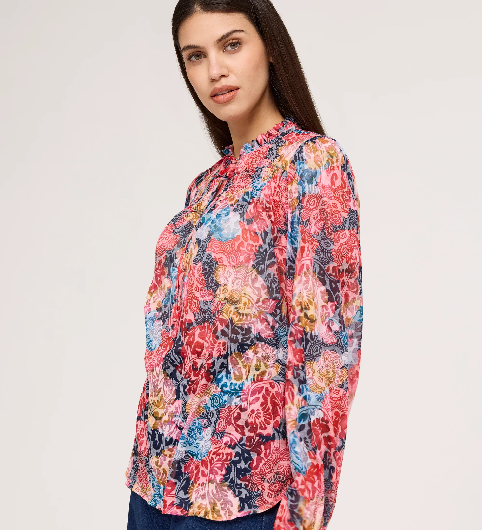 The Lizzie Blouse is the embodiment of effortless, feminine charm. This long sleeve blouse is defined by a delicate frill stand collar and a versatile tie neck that can be worn open or closed to suit your style. It is detailed with intricate shirring at the yoke and features voluminous full length blouson sleeves finished with elasticated cuffs. Cut in a comfortable relaxed fit, this printed blouse is a dependable hero piece that pairs perfectly with high waisted denim for a polished yet easy look.