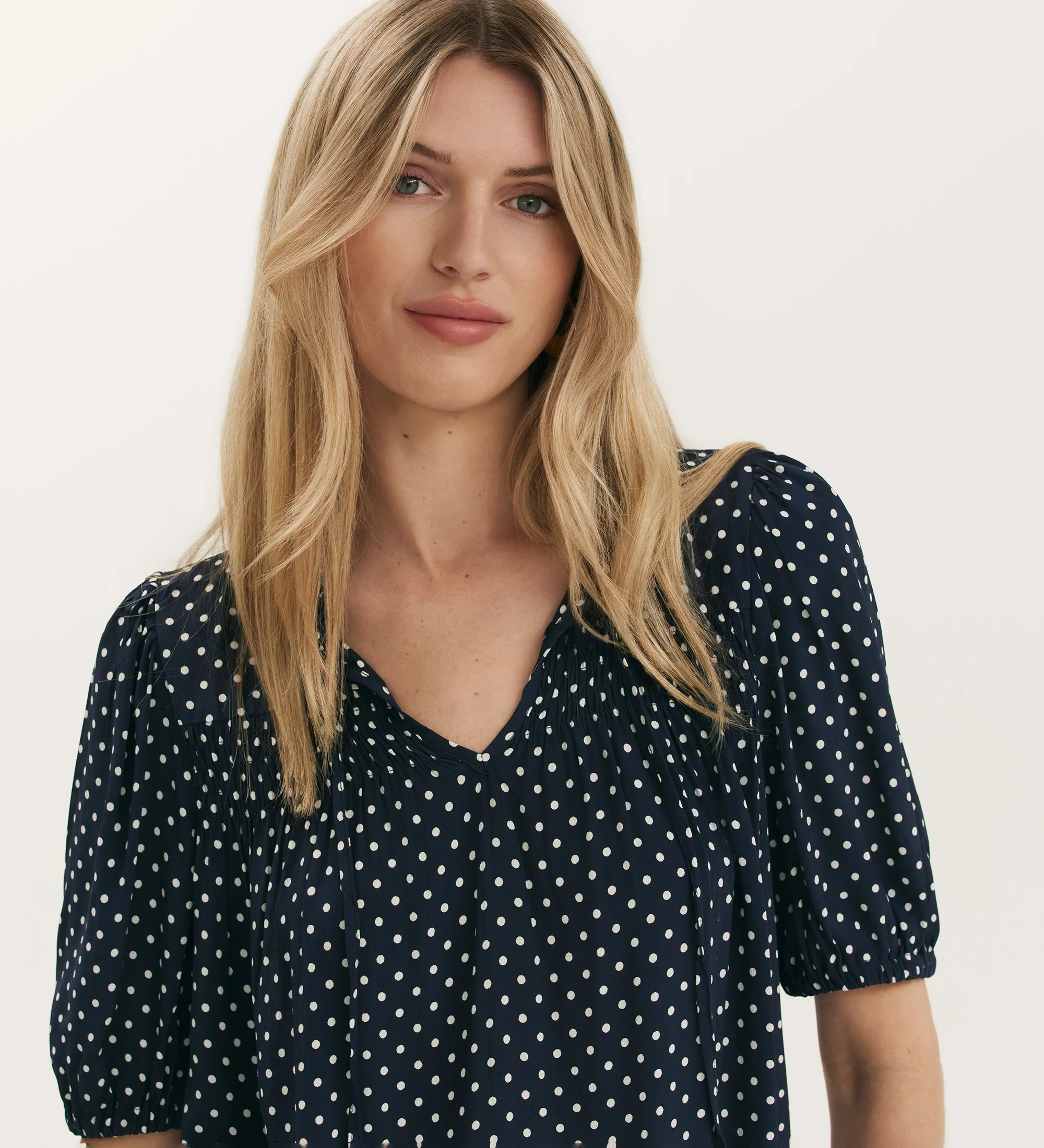 In a relaxed fit style, our Macie navy polka dot blouse is crafted from a lightweight crepe fabric for a floaty feel with a tie-detail notch and frill neck. Macie also features a shirring yoke detail and short puff sleeves with elasticated cuffs.