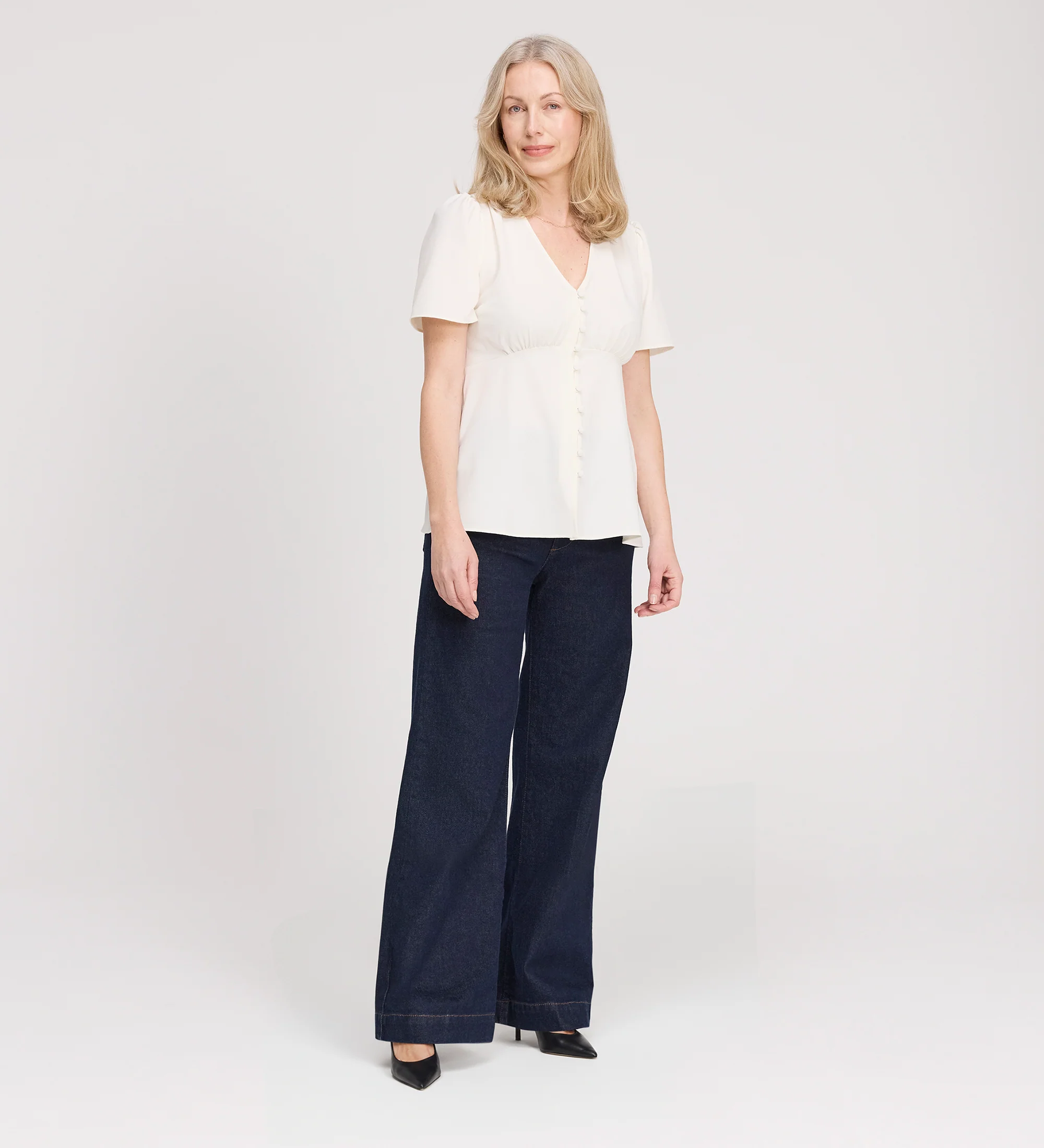 The Maryam Top is all about subtle shaping in a comfortable, everyday silhouette. It features a structured empire waist seam with gentle gathers into the bust, creating a flattering line that feels easy to wear. The V-neckline and button through front are balanced by short sleeves with soft gathers at the shoulder, adding just a touch of volume. It is a reliable piece for adding a bit of character to your standard trouser and top combination.