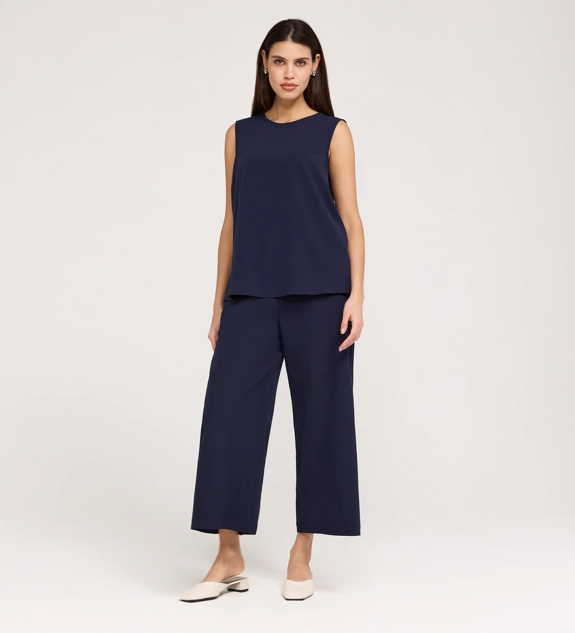 A sleek and stylish wardrobe essential, meet Simone, our navy cropped wide-leg trousers with pockets. Crafted from crepe, with a wide elasticated waistband, she promotes comfort without compromising on style.
