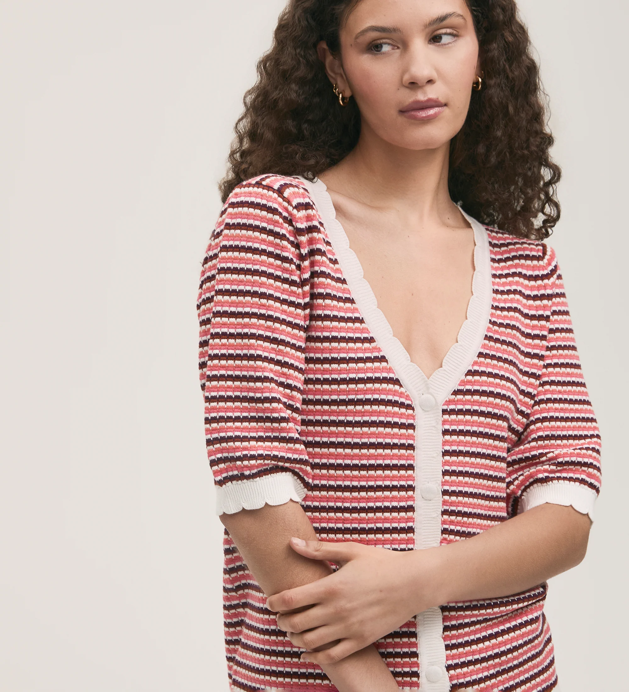 Meet Willa - a pink striped v-neck cardigan that has a button-up front and promotes a relaxed fit. She also features short sleeves and has scallop ribbed detailing on the neckline, cuffs and hem.