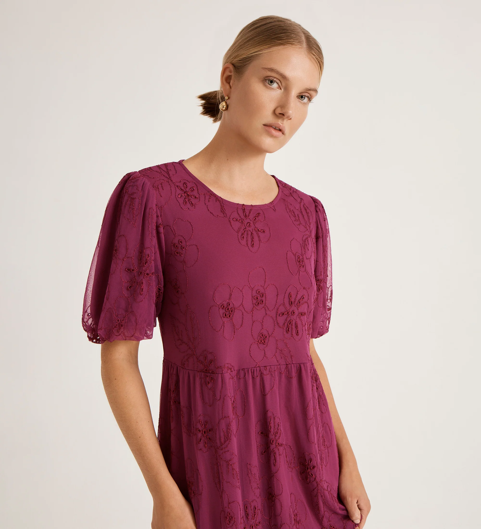 The Yasmine Dress is an effortless choice for easy all in one styling. Crafted from a delicate floral embroidered mesh fabric, this version of the Yasmine offers a soft, textured look with a comfortable relaxed fit. It is defined by a classic round neckline and feminine short puff sleeves with elasticated cuffs for adjustable volume. The waist seam leads into a flowing tiered skirt, while a button and keyhole fastening at the back neck ensures a clean, polished finish.